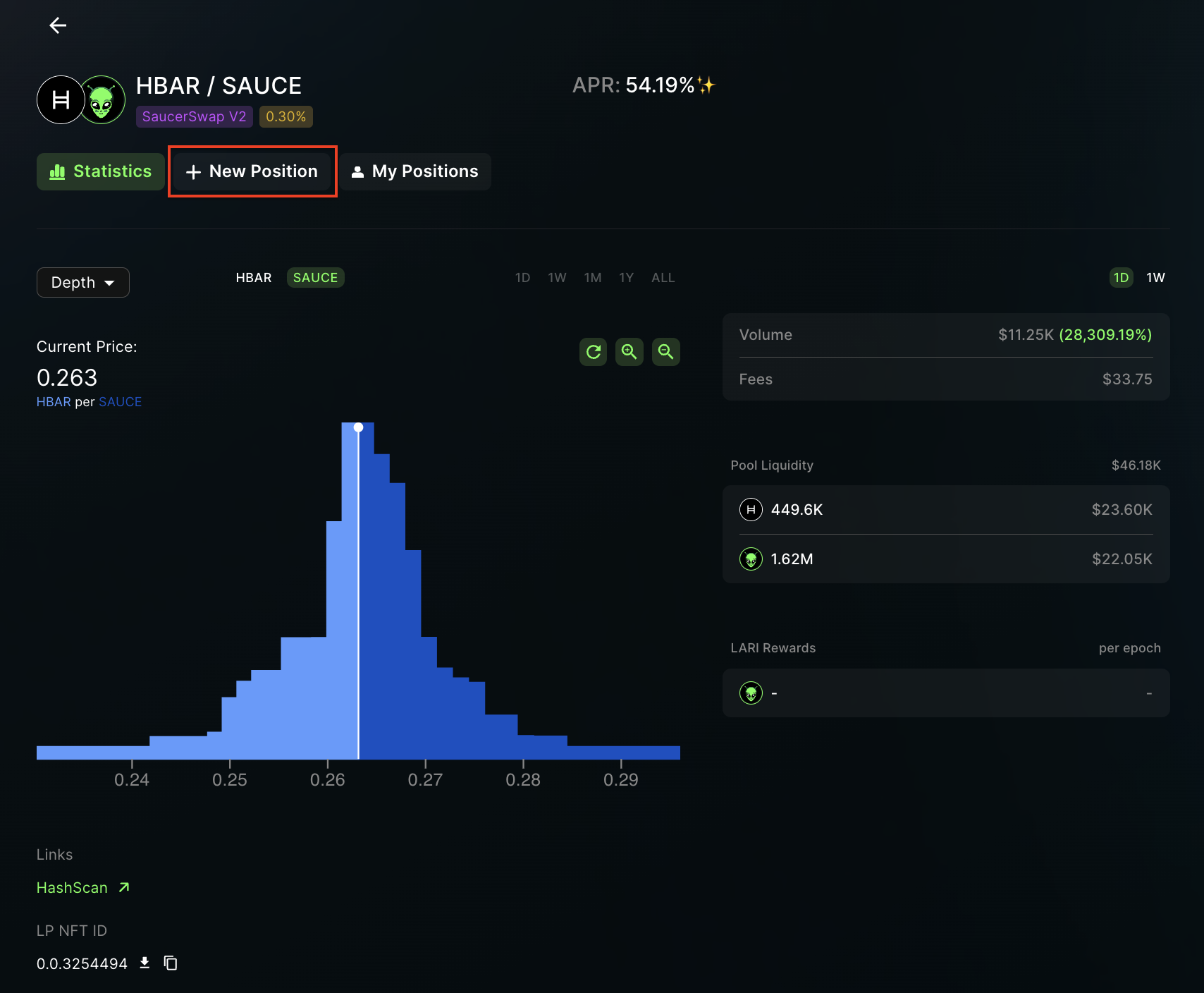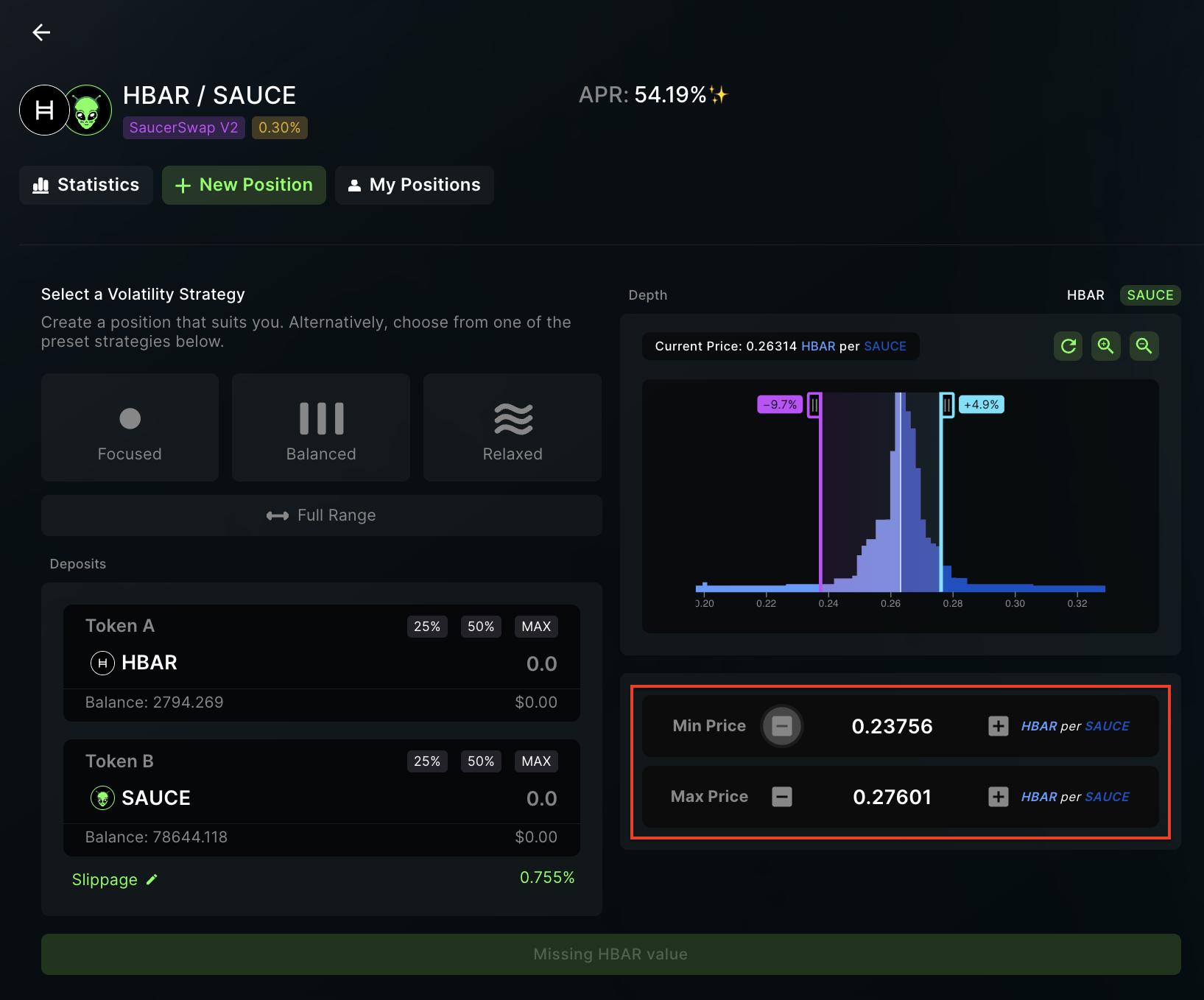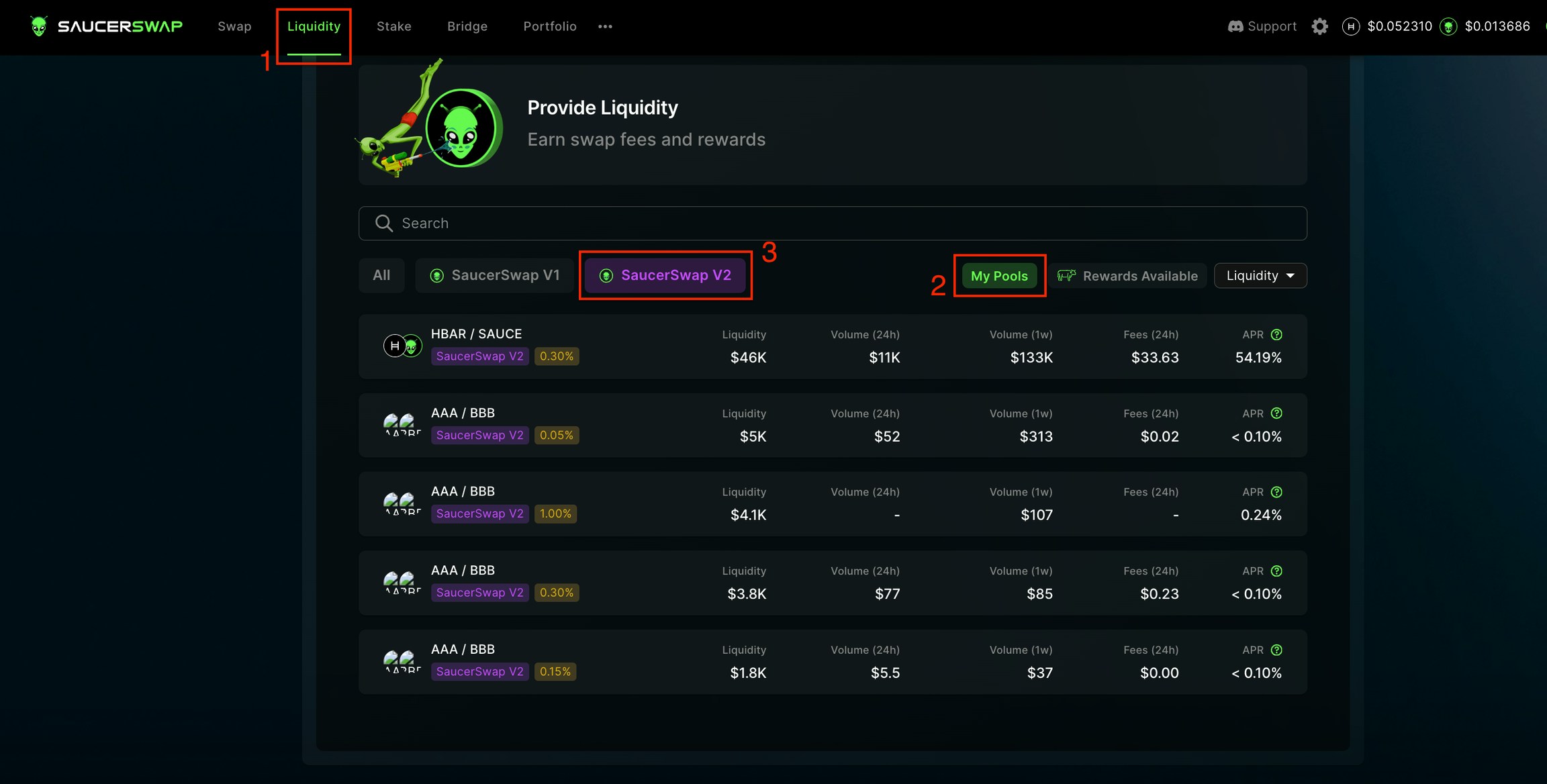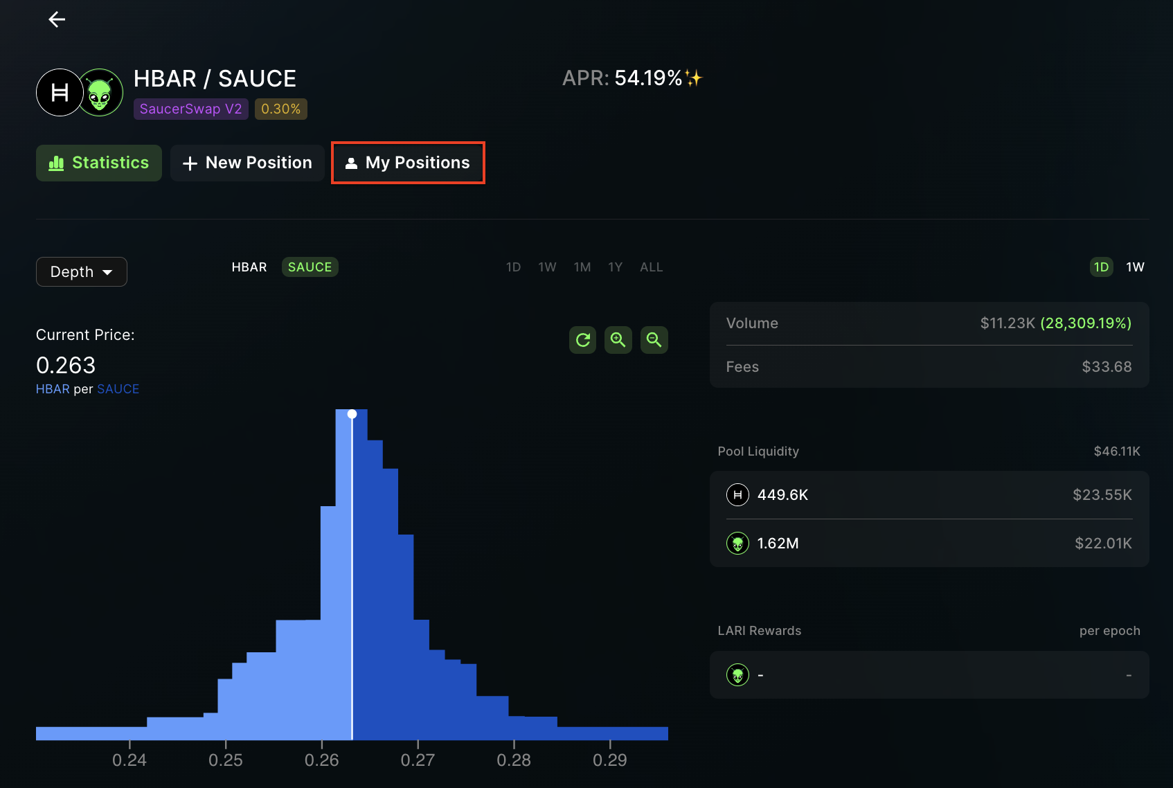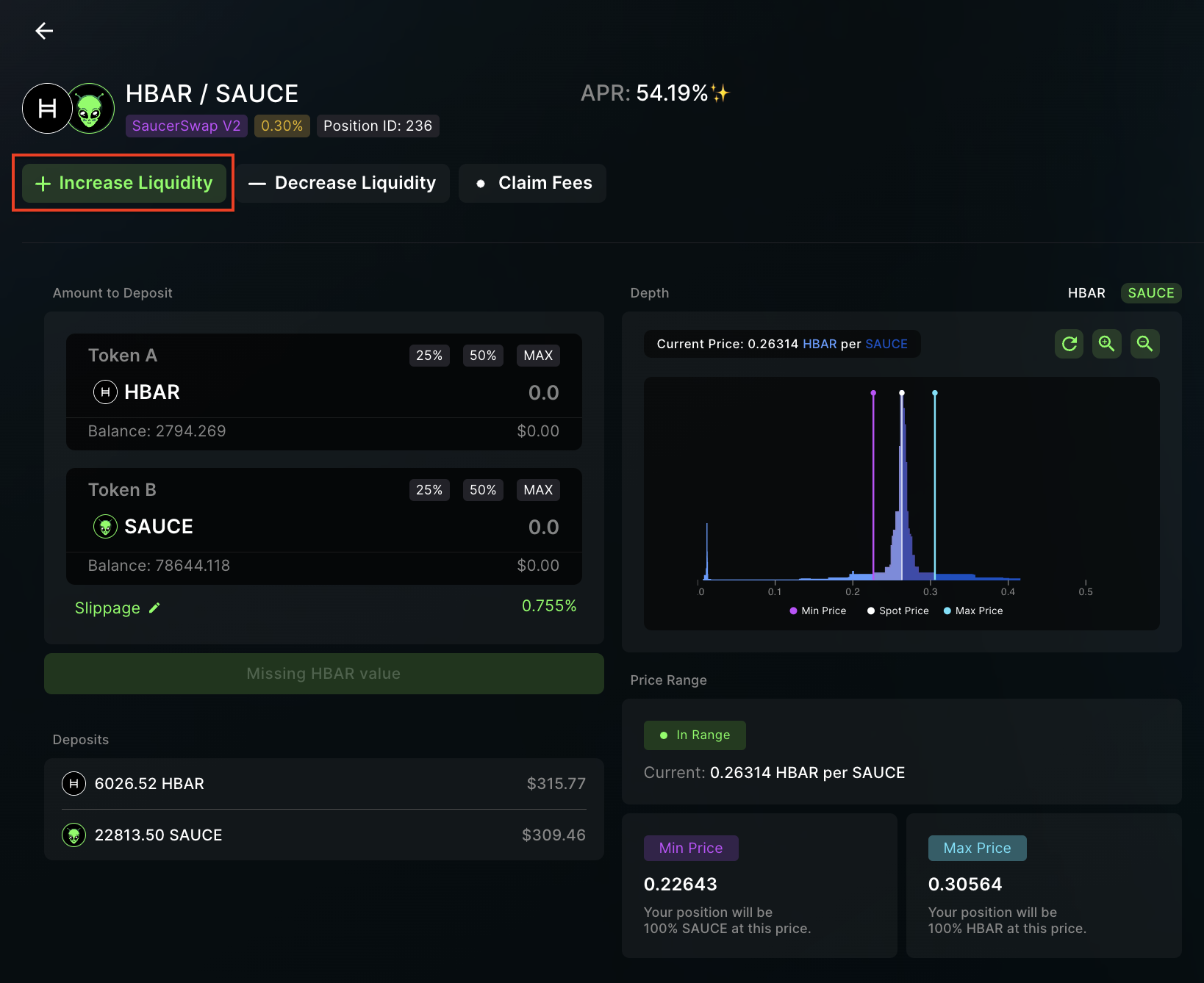 - Ensure you have sufficient HBAR for network fees and existing liquidity positions.