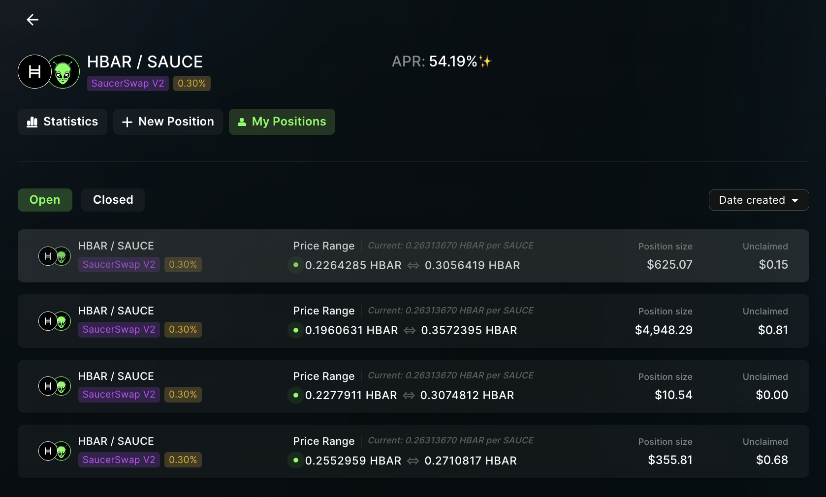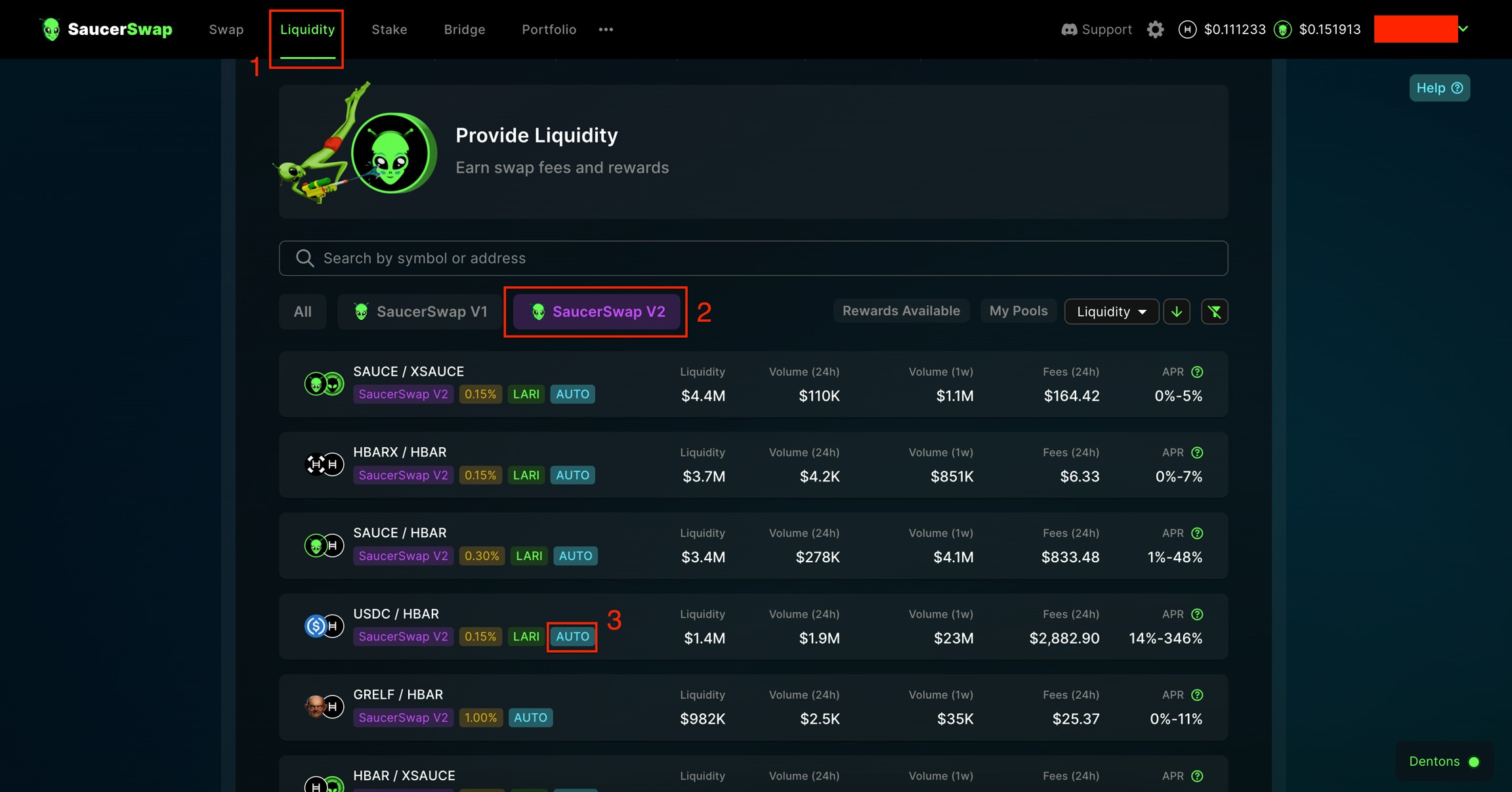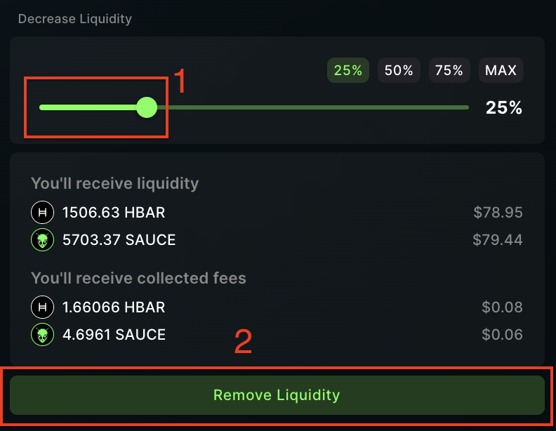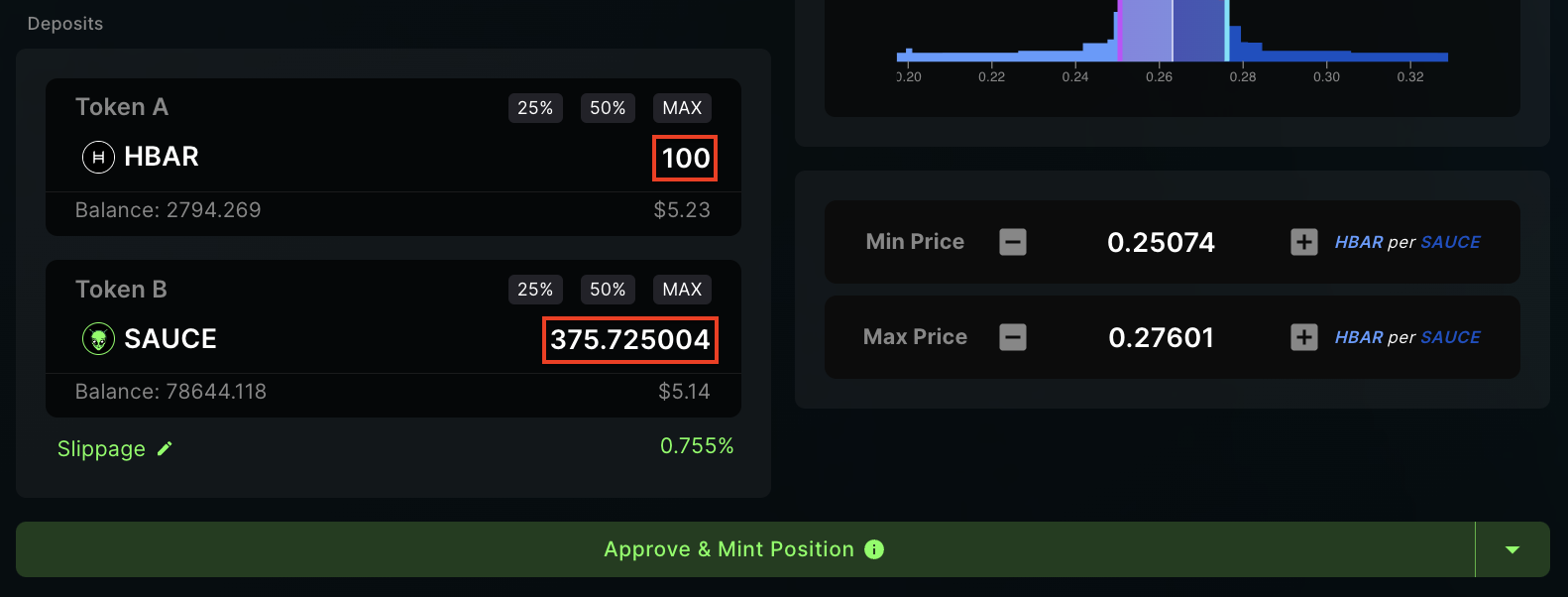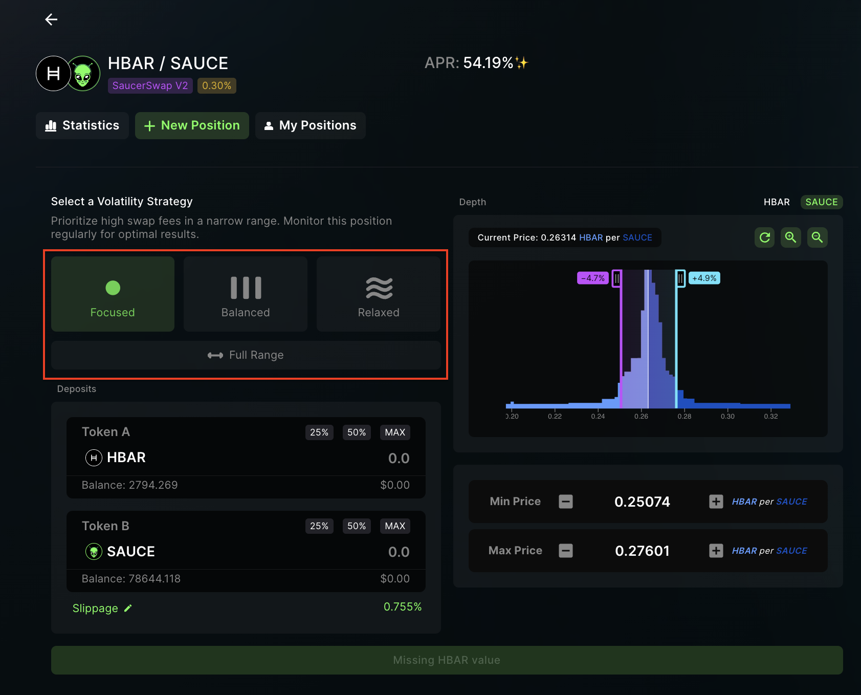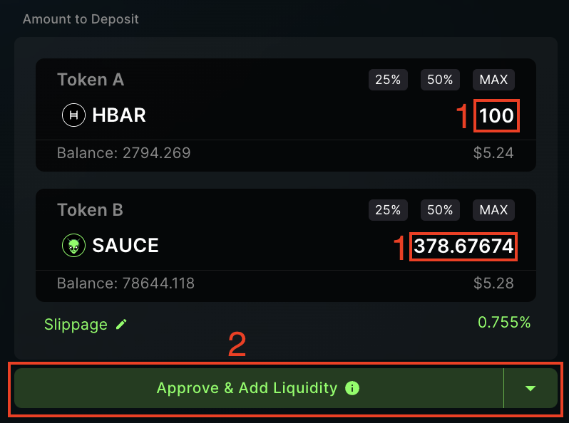 - Ensure you have sufficient HBAR for network fees and existing liquidity positions.