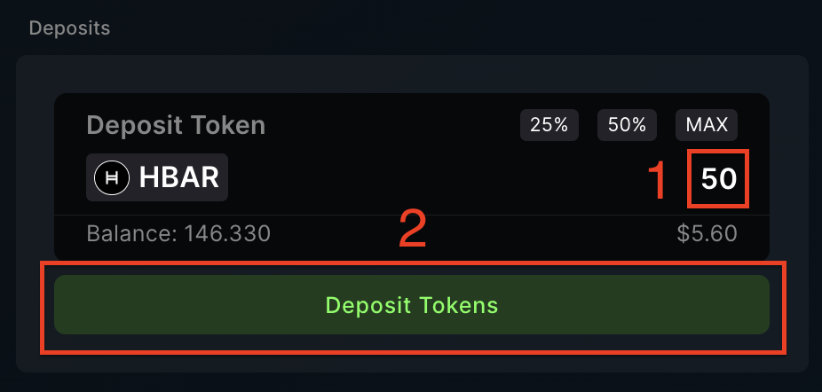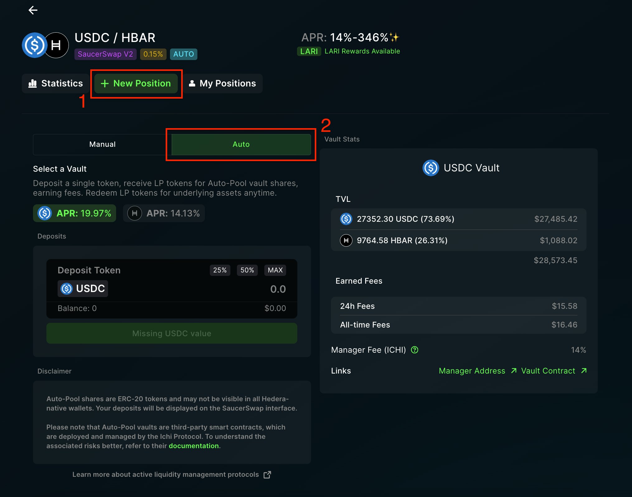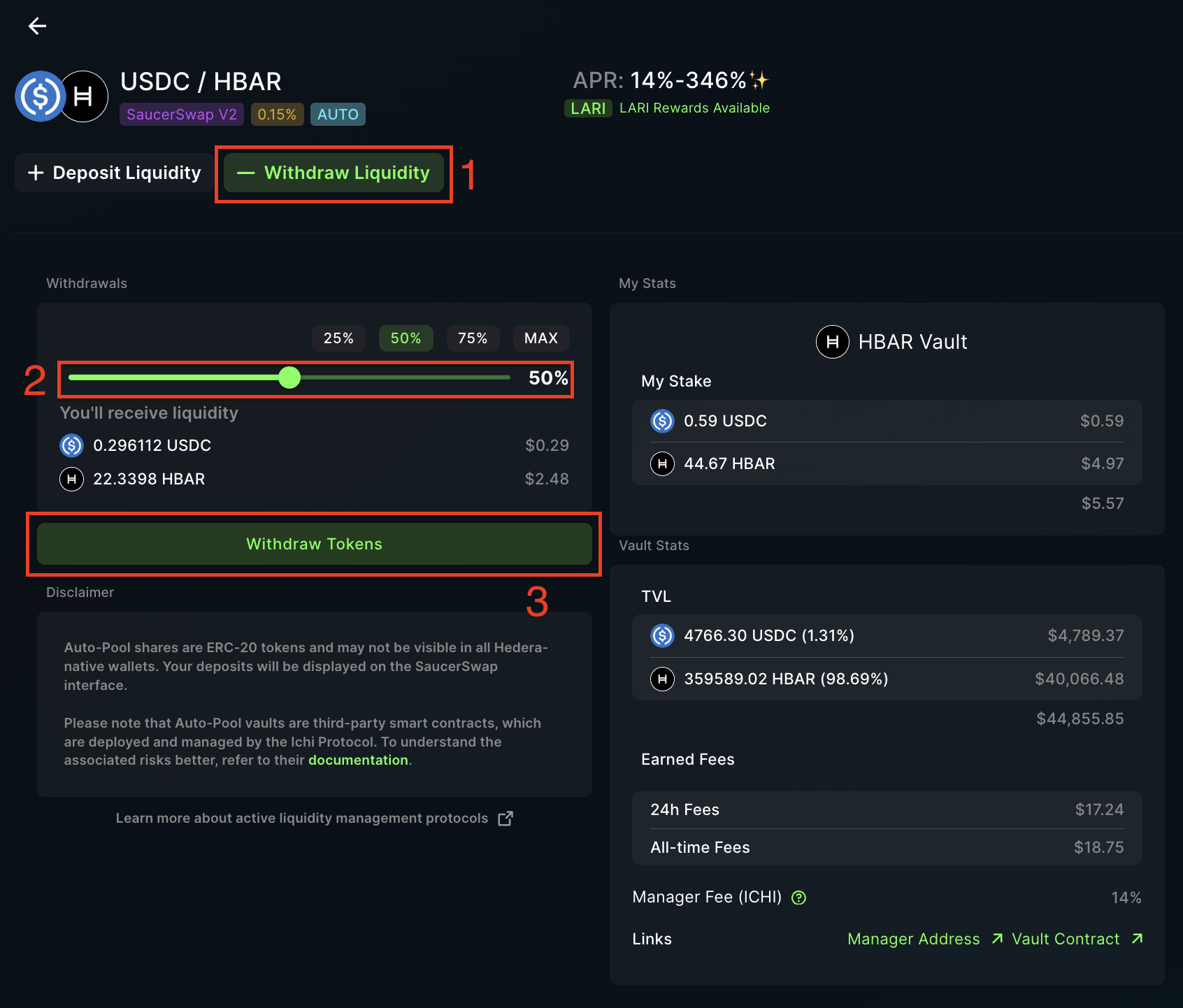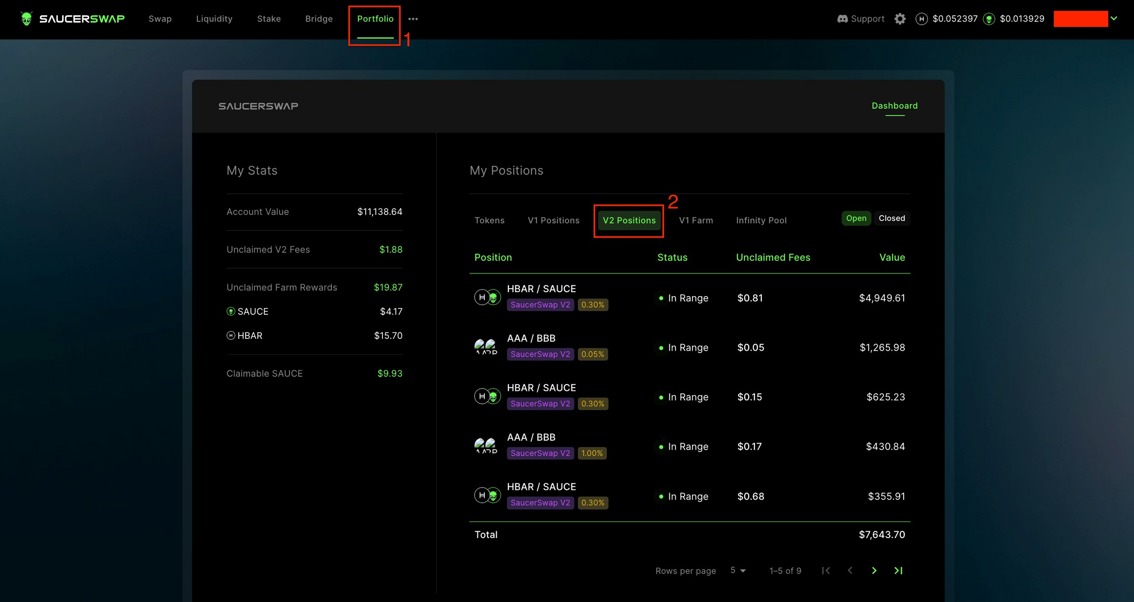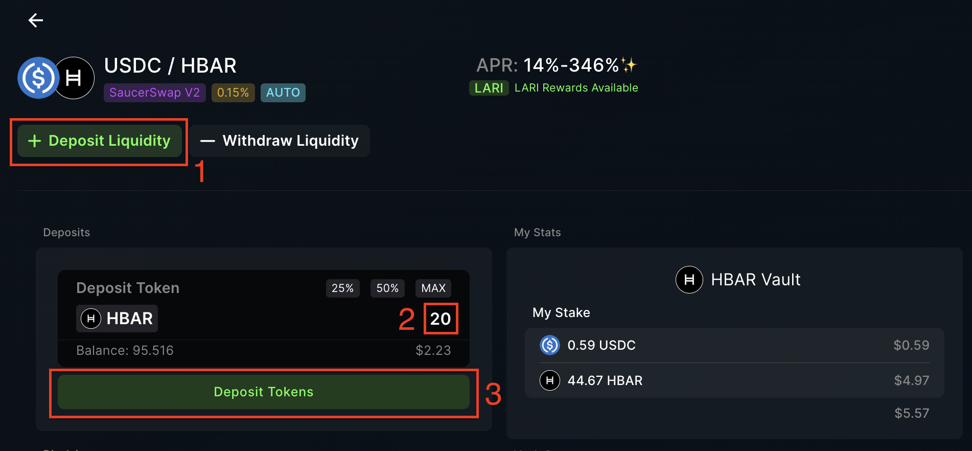 - Ensure you have sufficient HBAR for network fees and existing liquidity positions.