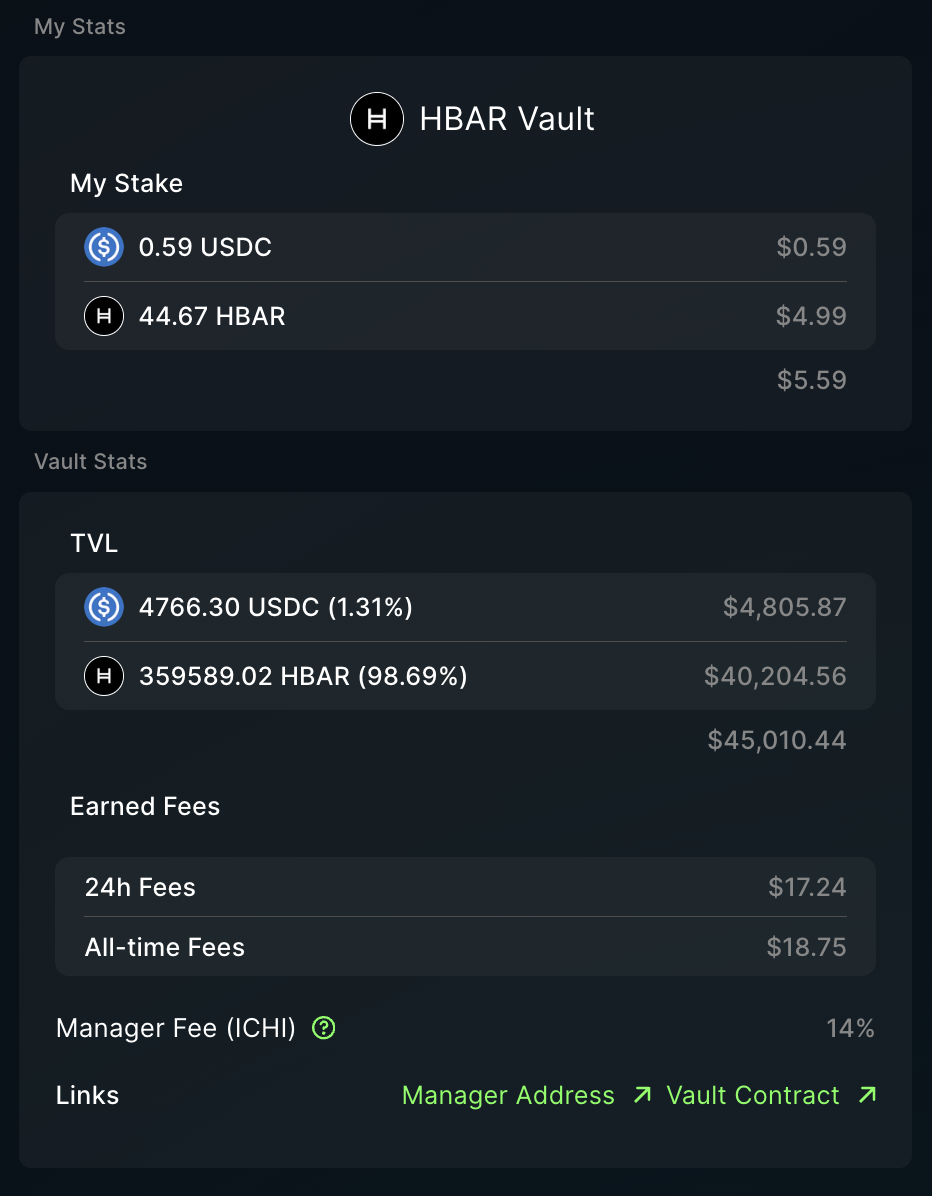 - On the “My Position” page, you can view details including your deposited liquidity, as well as the global vault statistics like TVL and Earned Fees.